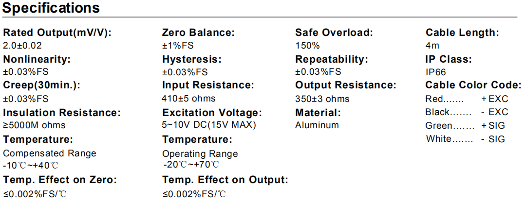 SMT-500N/SMT-1000N稱重/測力傳感器技術參數