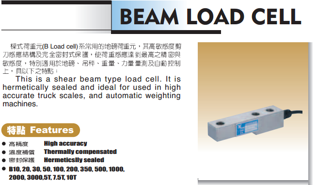 臺灣JIHSENSE B型荷重元( B Load cell)系常用的地磅荷重元,其高敏感度剪刀感應結構及完全密封式保護,使荷重感應達到最高 之精度與敏感度,特別適用於地磅、吊秤、重量、力量量測及自動控制上,具以下之特點: