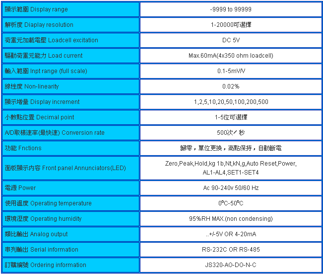 臺灣JIHSENSE JS-320稱重顯示控制器可標配本品牌所有模擬荷重元規格: