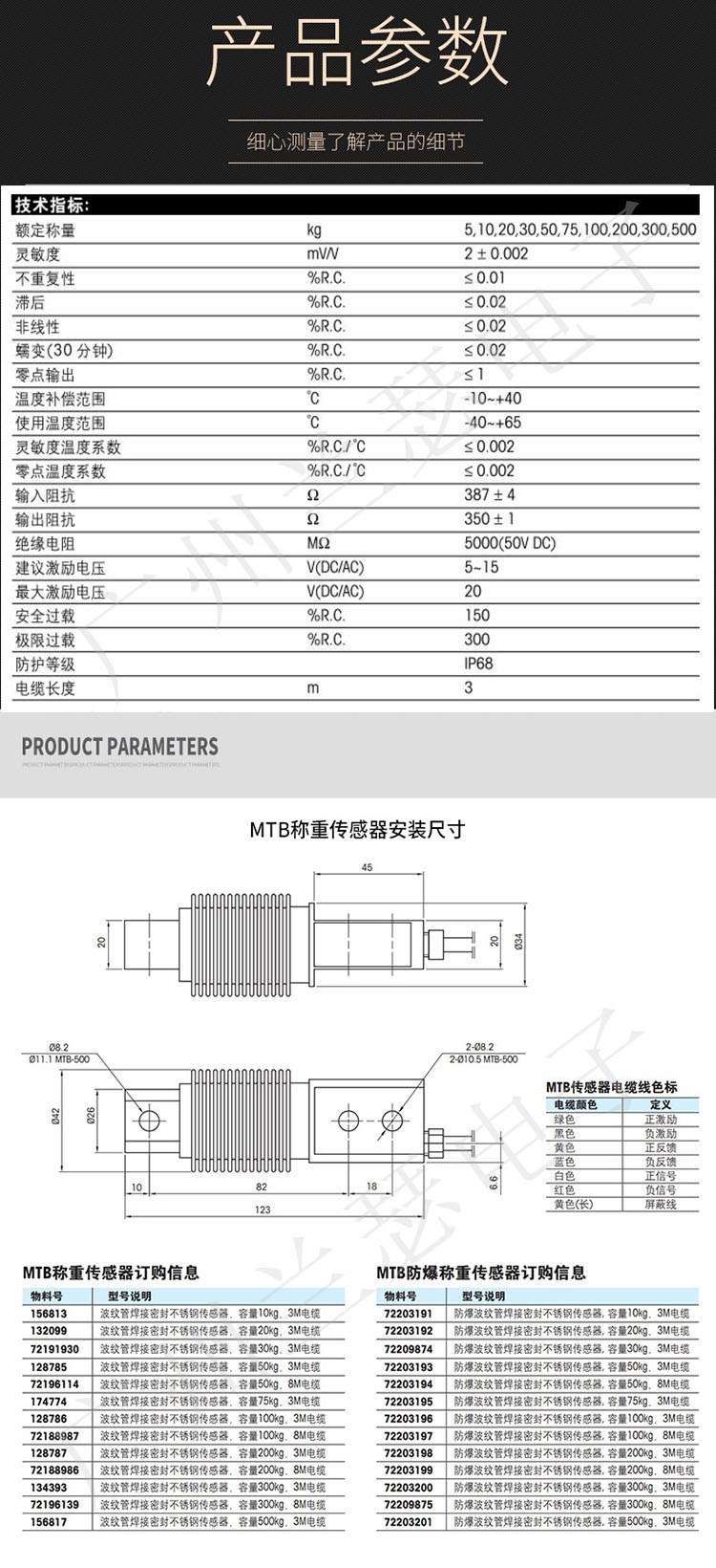 注:MTB-5是梅特勒-托利多傳感器中容量為5KG。所以容量為5KG,那么型號就是MTB-5。以止類推得到MTB系列的所有型號。