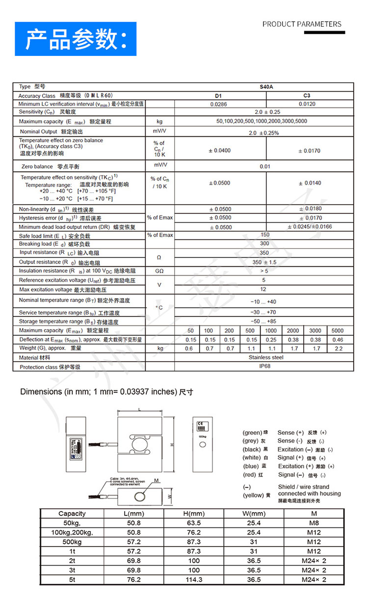 S40A/200KG稱重傳感器保護等級:EMC 認證