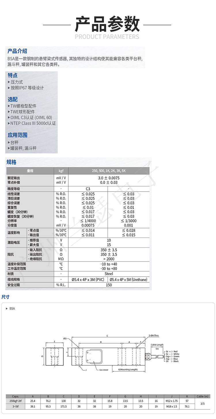 韓國凱士CAS BSA-1T稱重傳感器參數(shù)