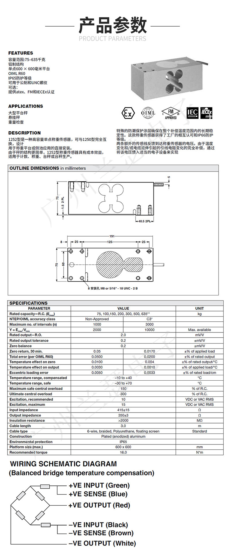 | 1252(75-635kg)稱重傳感器,美國Tedea 1252單點式傳感器 |