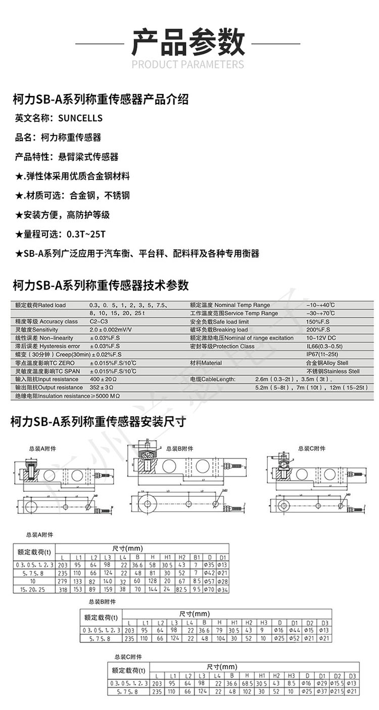 美國SUNCELLS SB-A-2T稱重傳感器產品參數: