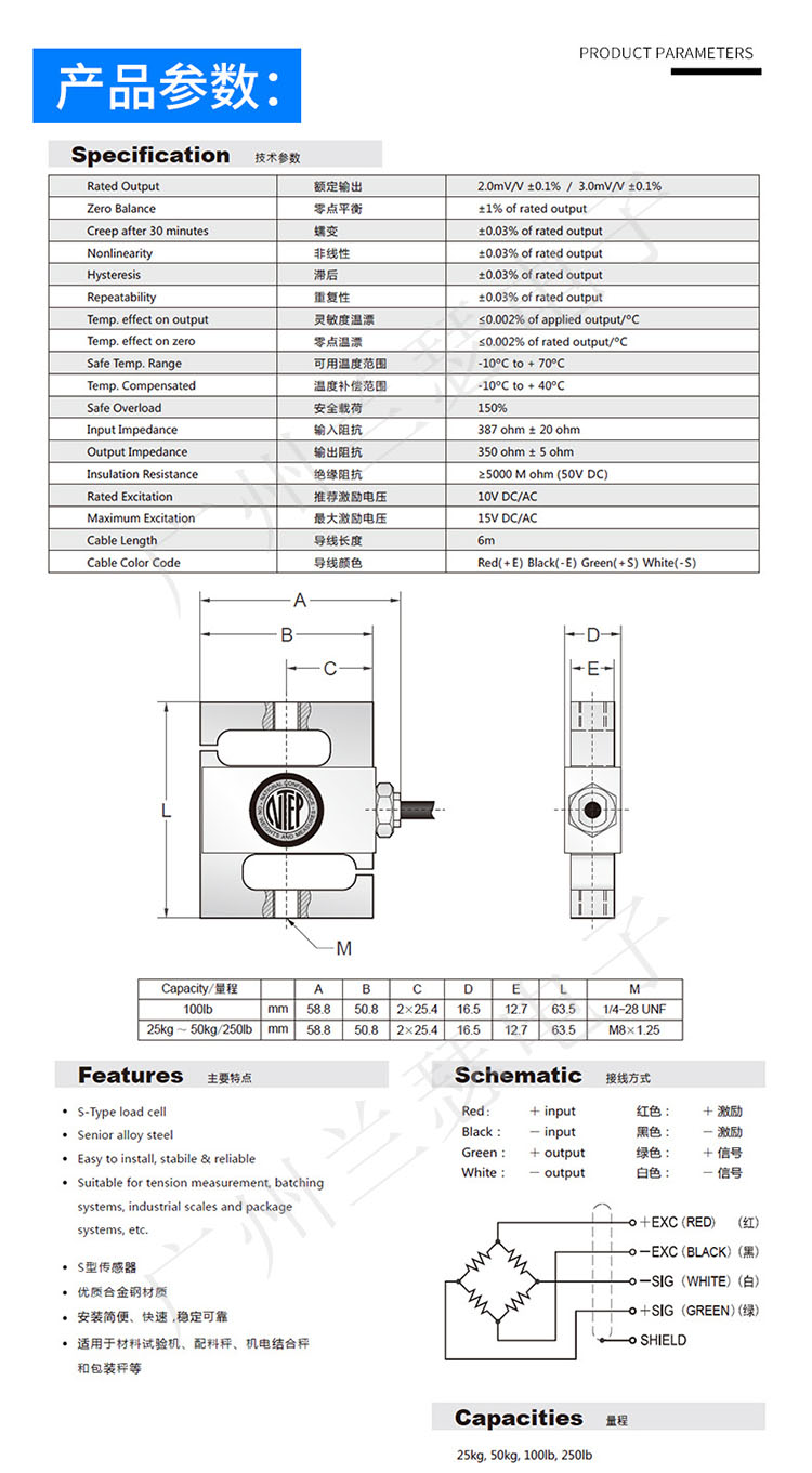 美國傳力BSA-50kg稱重傳感器技術參數: