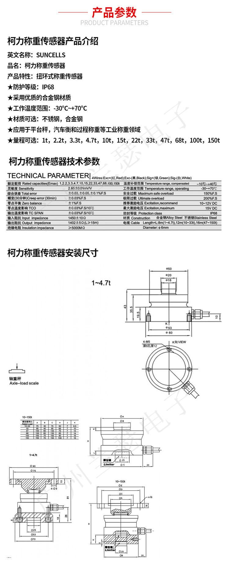 扭環(huán)式傳感器;優(yōu)質(zhì)合金鋼材質(zhì);防護(hù)等級IP 68,具有很好的防水防濕功能,量程齊全,高精度;適用于料平臺秤,汽車衡和過程稱重等工業(yè)稱重領(lǐng)域。