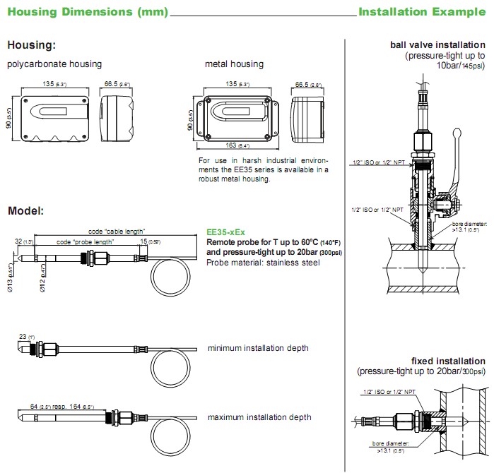 EE35 系列變送器的機械結構采用模塊化設計,儀表易于安裝維護。它采用了E+E公司的HC系列高性能濕度敏感元件。變送器內部有自動校準程序,露點測量精度在 -60...60°C Td (-76...140°F Td)的測量范圍內保持在 ±2°C Td 以內。