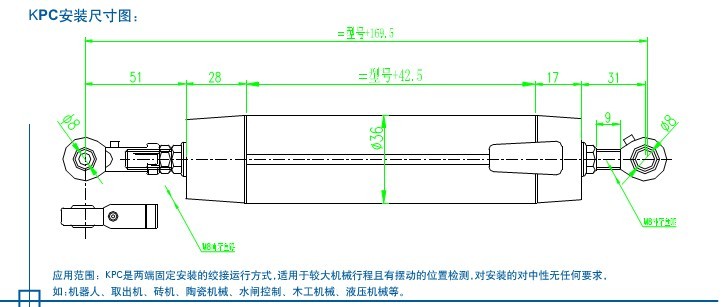 KPC絞接式電子尺,有效行程75mm~1000mm,兩端均有4mm緩沖行程,精度0.05%~0.04%FS。外殼表面陽極處理,防腐蝕;內置導電塑料測量單元,無溫漂,壽命長;具有自動電氣接地功能。KPC絞接式位移傳感器可適用在大多數通用場合,特別適用產品本體不能固定,擺動運動的場合,無需對中;允許極限運動速度:垂直安裝時為10m/s,水平安裝時為3m/s。